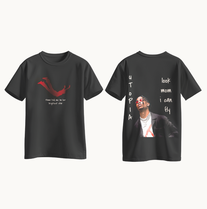 Shine in style with this premium 100% cotton unisex tee (180 GSM) featuring “Mama told me I'm the brightest star” on the front and “Utopia – Look Mom I Can Fly” with a Travis Scott graphic on the back. Soft, breathable, and built for everyday confidence.
