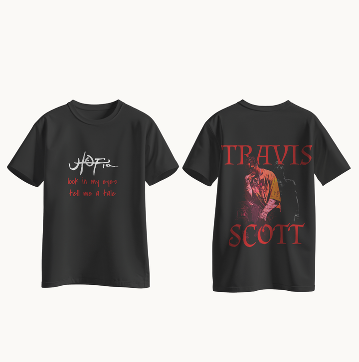 Make a bold statement with this 100% cotton unisex T-shirt (180 GSM) featuring “Look in My Eyes, Tell Me a Tale” on the front and a striking Travis Scott print on the back. Soft, breathable, and built for everyday comfort - the perfect blend of style and attitude.